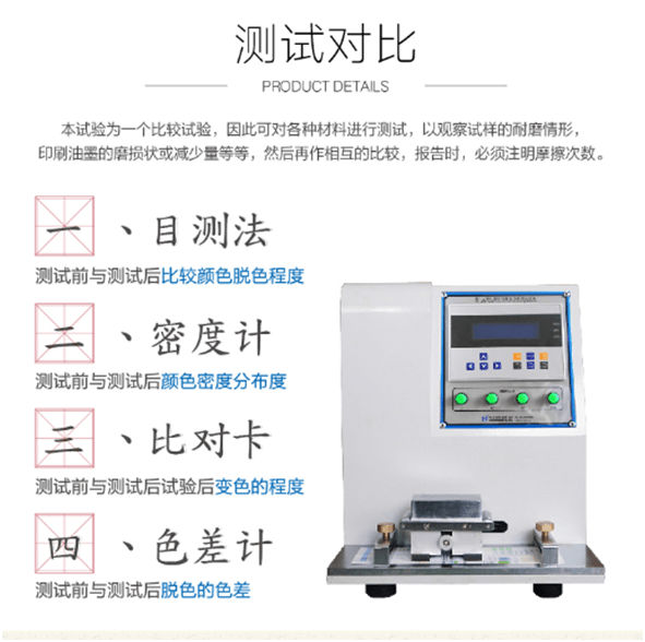 HD-A508印刷油墨脫色耐磨試驗儀適用于印刷品印刷墨層耐磨性將干或濕的標(biāo)準(zhǔn)摩擦紙包于摩擦頭,以規(guī)定壓力、往復(fù)摩擦行程及速度進(jìn)行摩擦試樣表面,觀察試樣墨層脫落情況,確認(rèn)試樣及標(biāo)準(zhǔn)摩擦紙污染痕跡或試樣表面出現(xiàn)起毛或磨損。