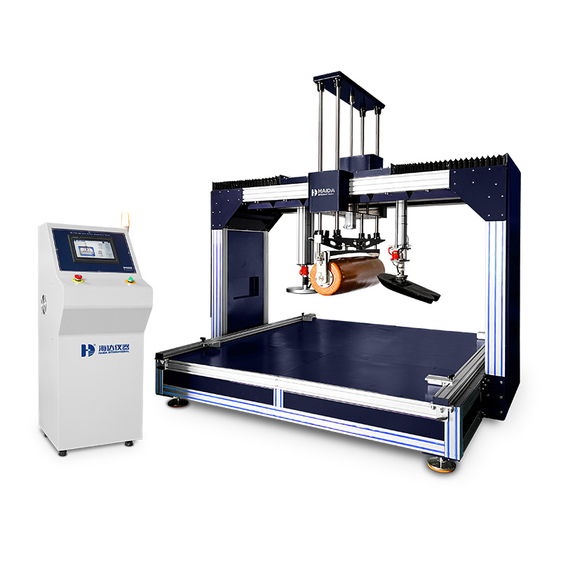 本機(jī)適用適用于強(qiáng)力彈簧床墊、普通彈簧床墊、泡沫床墊、棕纖維彈性床墊的綜合力學(xué)測(cè)試。模擬人類(lèi)睡眠中不斷的翻滾而設(shè)計(jì)的機(jī)器,采用一個(gè)滾動(dòng)式加載模塊水平放置在床墊規(guī)定的加載部位,以一定頻率滾動(dòng),對(duì)床墊進(jìn)行往復(fù)加載,以檢驗(yàn)床墊對(duì)長(zhǎng)期重復(fù)性滾動(dòng)載荷的承受能力。其中還配備了包括測(cè)高、軟硬度、滾動(dòng)疲勞的測(cè)試;符合國(guó)家、EN、ASTM(選購(gòu))等多個(gè)測(cè)試標(biāo)準(zhǔn)要求。